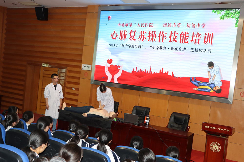 今年5月8日是第76个“世界红十字日”,为提高师生对突发状况的自救与互救能力,5月9日下午,南通市第二人民医院行政二党支部、门急诊党支部的医护志愿者走进了南通市第二初级中学的校园,为初二年级的师生们带去了一趟精彩、生动的“生命教育,‘救’在身边”的急救知识与技能培训讲座。