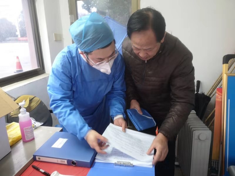 市二院65岁的老党员、离退休支部书记、脑外科原主任吴坚主动申请参加高速公路疫情监测工作,下图为吴坚主任与袁沛文护士在卡口进行值班交接。