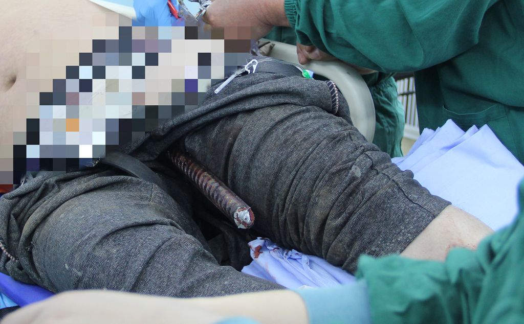 3月27中午12点50分,一位从高处跌落,钢筋贯穿伤的伤者被送至南通市第二人民医院急诊科。患者送到医院时,只见一根直径约2厘米粗的钢筋露在体外,裸露的钢筋长达20多厘米;钢筋从其左侧大腿内侧刺破皮肤插进盆腔。该伤者正是朱先生,他是一名建筑工人,中午在陈桥某工地施工过程中不慎从3米高处摔落,导致钢筋刺入体内。
