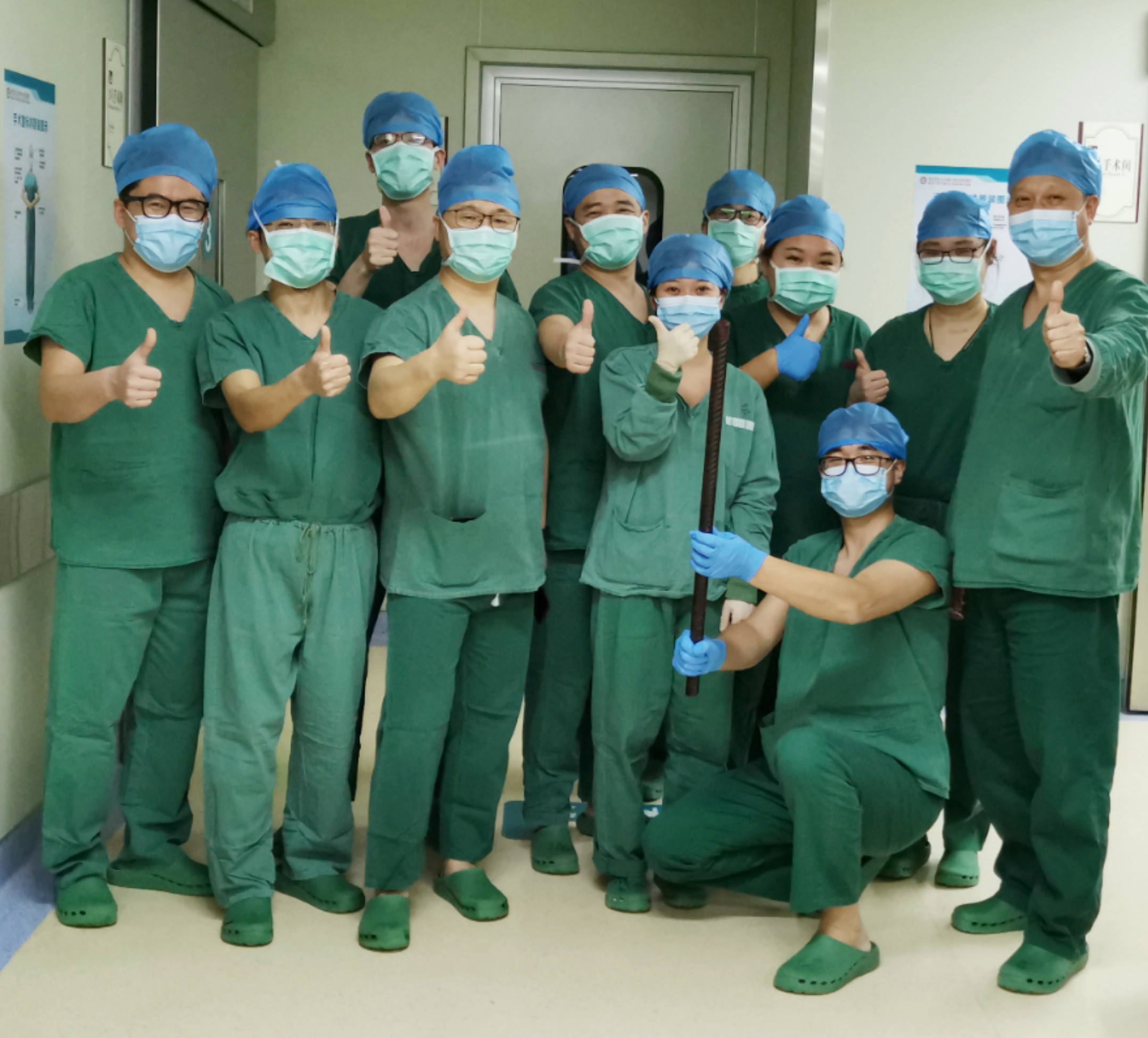 随着皮肤、皮下、筋膜、肌肉、腹膜得层层分离,钢筋显露得深度越多。此时手术室里空气似乎凝固了一样,所有的眼睛注视着泌尿外科副主任王健的双手。大家大气不敢出一声,只听王健说:“肾没事,小肠、结肠没事,钢筋压迫髂总静脉。”考虑到髂总静脉被钢筋压迫,拔出后很可能大出血,王健预先将髂总静脉骨骼化进行预阻断,充分暴露视野,随后长达将近1米的钢筋缓缓被拔出,血流奔涌而出,“3-0的普理灵缝线”王健边说边沉着冷静的进行缝合,很快血流止住。大家提到嗓子眼的心终于落地了。