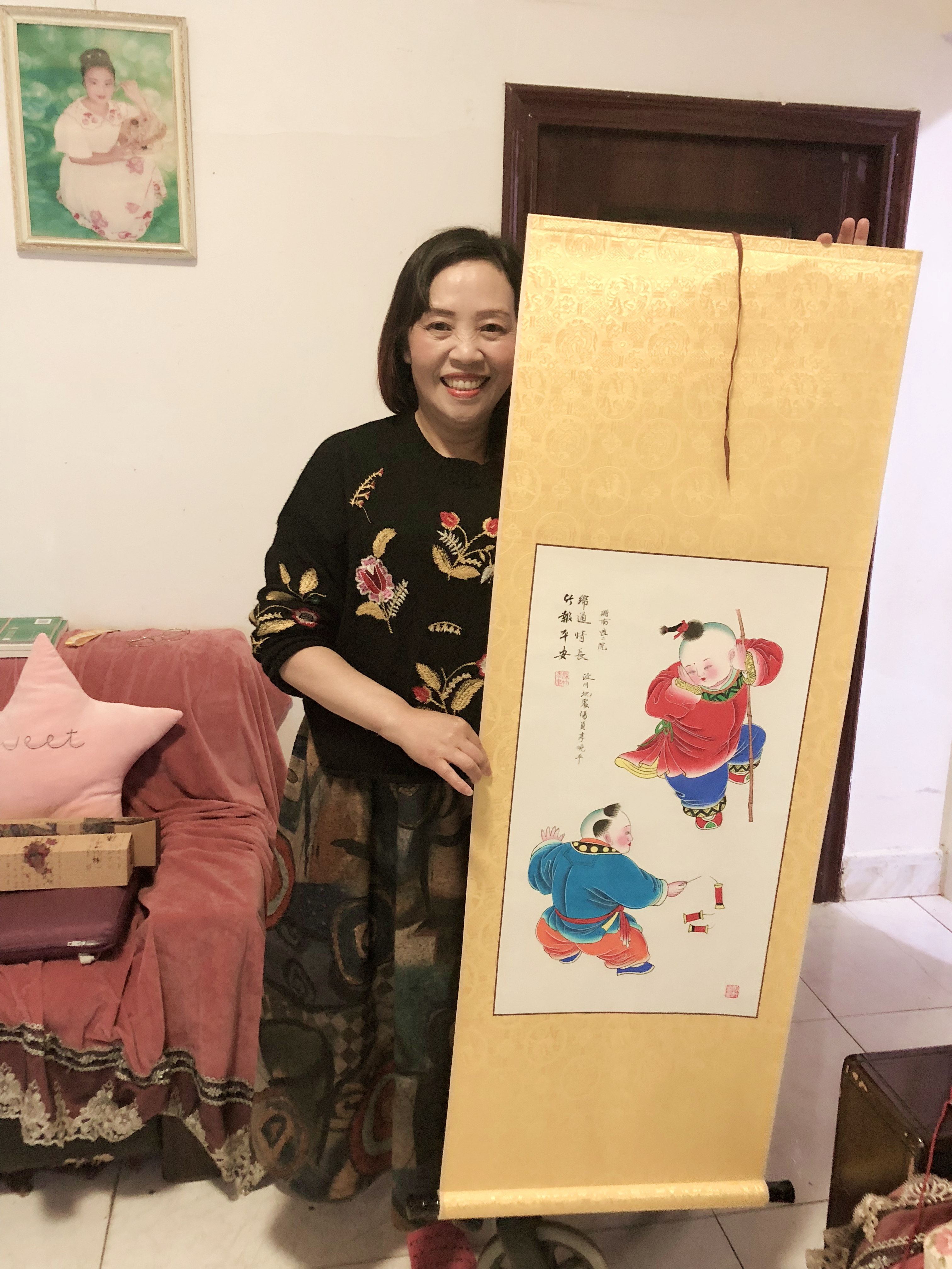 收到一份特殊的礼物,十年前医院收治的汶川地震伤员李晓平寄来她亲自绘画的一幅绵竹年画作品,并且上书“竹报平安,绵通情长——赠街射
