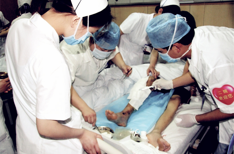 作为江苏省唯一指定参与抗震救灾的二级医院,从四川绵竹接回了九名地震伤员。当时,因当地卫生条件限制,来通的大部分伤员都出现了不同程度的伤口感染,有的病程过长,需要二期伤口处理或手术,街射