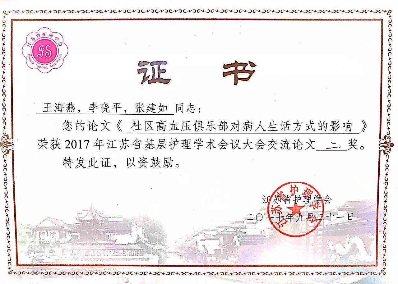 百花社区卫生服务站的王海燕护士,交流的题为《社区高血压俱乐部对病人生活方式的影响》一文喜获二等奖!