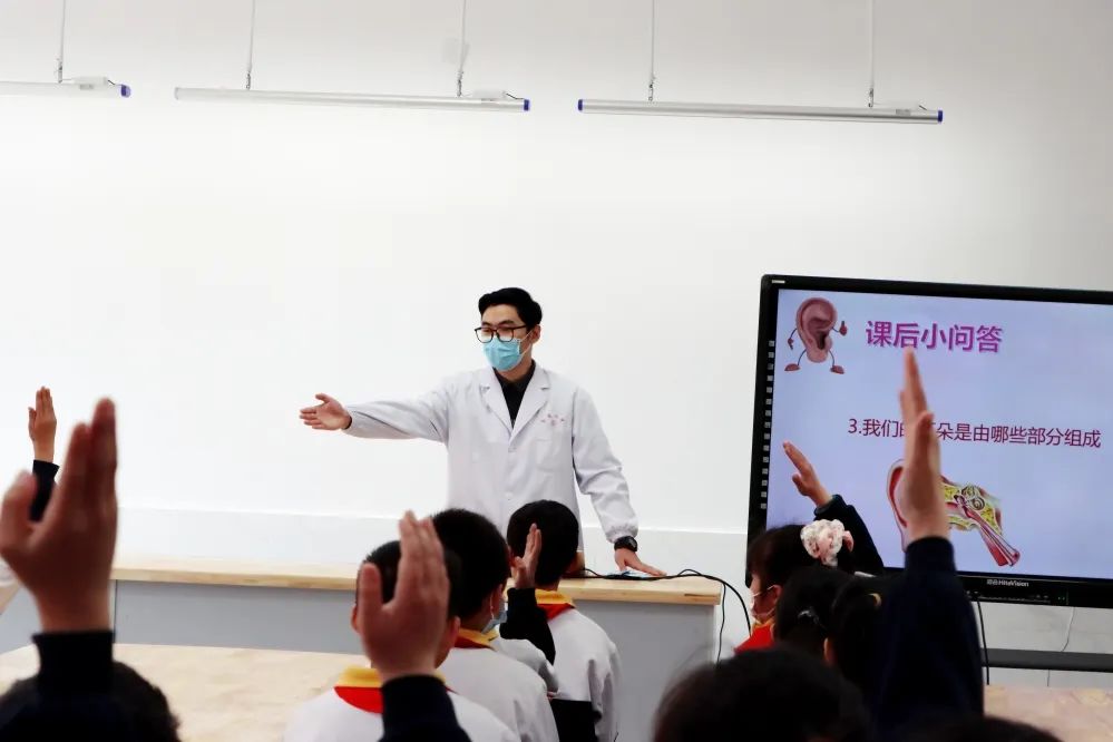讲座现场,街射 耳鼻喉科主治医师孟彬彬为孩子们进行了一场精彩纷呈的科普讲座,从耳朵的构造、听力的产生、哪些因素会损害耳朵和听力以及日常生活中如何保护耳朵、防治听力损失等方面做了深入浅出的讲解,孟彬彬医生讲得妙趣横生,孩子们听得全神贯注,现场气氛热烈、互动频繁。